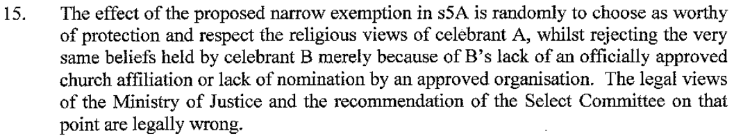 “The Bill, in its present form, fails to protect individual freedom of religion and belief (belief being a comprehensive viewpoint not based on religion). The proposed amendment only protects group religious rights, which is little protection at all for most religious celebrants as few denominations hold formal views on marriage, many practitioners of religion do not belong to a group and for those that do they might hold a different personal view on this topic to the group view. The amendment then fails to protect the religious freedom of most religious celebrants just as it utterly fails to protect the freedom of belief of non-religious celebrants who have no group to appeal to to protect their freedom.”