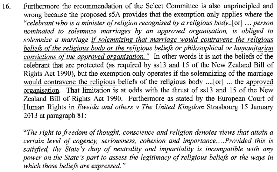 “The proposer of the Bill said that the Bill was not intended to compel marriage celebrants to perform marriages contrary to their religious beliefs. However, in the Law Society’s view, Professor Rishworth says it is arguable that marriage celebrants who refuse to perform same-sex marriages will be acting unlawfully under the Human Rights Act 1993, the New Zealand Bill of Rights Act 1990, or both.